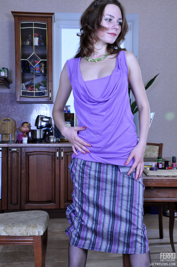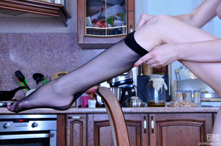 Slim-legged hottie adjusting her black seamed stockings with a lacy garter